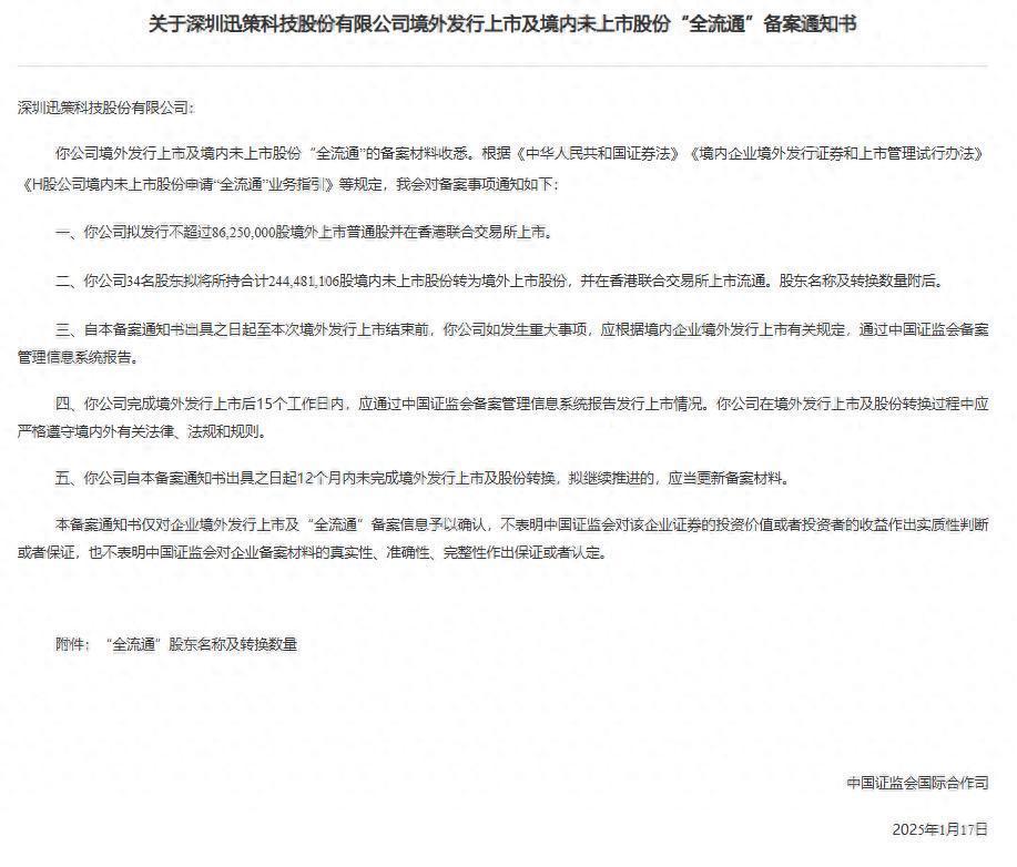 智通财经APP获悉,1月17日,中国证监会发布关于深圳迅策科技股份有限公司境外发行上市及境内未上市股份“全流通”备案通知书。迅策科技拟发行不超过86,250,000股境外上市普通股并在香港联合交易所上市。此外,公司34名股东拟将所持合计244,481,106股境内未上市股份转为境外上市股份,并在香港联合交易所上市流通。