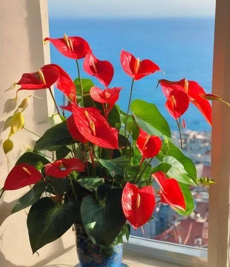 红掌的叶片油绿,这种花卉非常美观,可以直接水培。它的花朵呈红色,看起来生机勃勃,寓意美好,非常有格调。养护红掌需要提供充足的散光,保持通风透气的环境,并避免积水烂根。